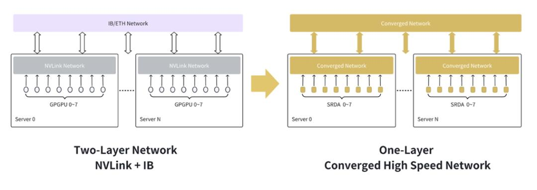 针对传统两层网络的痛点,SRDA 将节点内高速互联(Scale-up)和节点间通信网络(Scale-out)融合成统一的单层网络